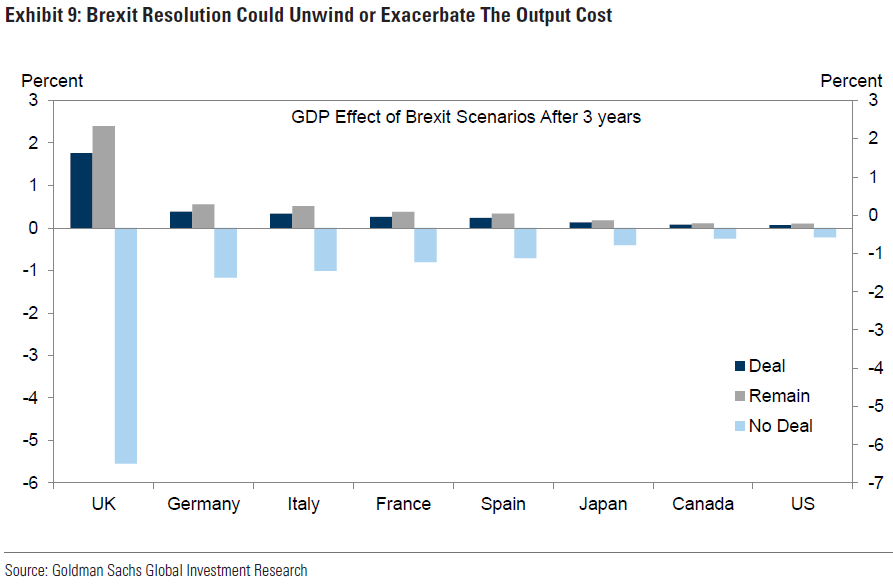 Goldman Sachs estimated in April 2019 that as of that date, the Brexit referendum and its subsequent delays, machinations, and uncertainties had cost Britain approximately 600 million pounds ($785 million) per week. As staggering as this figure is, it most certainly does not include diverted government time or the countless private sector labor hours devoted to endless and unproductive meetings. It may include the actions of companies that have assigned a value to wasted time, as well as the importance of business continuity, and moved their operations offshore, e.g. Bank of America’s decision in 2018 to redeploy business operations from London to Paris and Dublin starting in 2019.