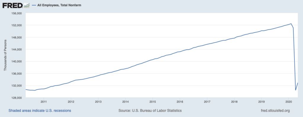 The so-called nonfarm employment “jobs numbers” reported each month by BLS at the same time that the unemployment figures are released also are derived from survey data. Different survey data. Whereas the unemployment figures are generated by the Current Population Survey (aka “Household Survey”) of 60,000 households in the United States, the figures on net new jobs each month are taken from the Payroll Survey (aka “Establishment Survey”) of 145,000 employers representing 697,000 worksites. In general, the Establishment Survey is considered a “cleaner” number than the unemployment rate, less influenced by the interpretation problems of the Household Survey. However, unlike the unemployment data, the jobs numbers are regularly revised/updated as survey responses arrive with some delay. In the latest report for May 2020, for example, the March and April job loss figures were revised downward substantially; March job loss was estimated at 1.4 million compared to an original 881,000 and April job loss was estimated at 20.7 million compared to 20.5 million. The 2.5 million increase in jobs for May can be expected to be revised in future reports, most likely upwards, as the culprit in the collection of the Establishment Survey data is the availability of someone at the surveyed company with the time to fill out the survey. One suspects that in the last three months, employers have been overburdened with things to do.