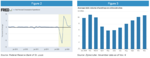 The most recent (November 6, 2020) estimate of fourth quarter US GDP growth from the GDPNow model is an annual average 3.5% growth, slightly up from an estimate taken just a few days earlier. This is an attention-deserving number when placed against the current estimate of third quarter GDP growth of 33.1%. The Beige Book summary released on October 21 elaborated on the deceleration in activity between the third quarter and the start of the fourth quarter –“Economic activity continued to increase across all Districts, with the pace of growth characterized as slight to modest in most Districts. Changes in activity varied greatly by sector”—and included the following illuminating commentary about employment conditions: