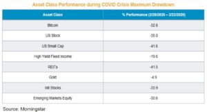 If investors can stomach the volatility, Bitcoin could potentially play a role as an uncorrelated hedge over certain periods of time against equity market downturns. However, investors must be prepared for the downside and understand the limitations of its role on the portfolio team. For example, during the S&P 500 maximum drawdown period from February 2020 to March 2020, Bitcoin did not play the role as a safe-haven asset or portfolio diversifier as it declined 32% vs. the S&P 500 decline of 35%.