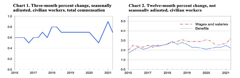 On July 30, 2021, the BLS released data showing the Employment Cost Index rose 2.9% in the 12 months between June 2020 and June 2021. Interestingly, the 12-month increase for the period from June 2019 to June 2020 was not appreciably different, at 2.7%. Looking back even further into the pre-pandemic era, once sees a fairly stable, non-accelerating ECI (https://www.bls.gov/news.release/eci.t01.html).