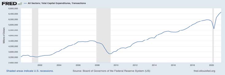 As with so much else, the pandemic seems it will push economies and their participants more quickly into a future that was only hinted at prior to January 2020; note that the upward slope of the capital expenditures chart line has increased of late, exhibiting a pattern quite different from the last recession in 2008-2009. With robust corporate earnings and improving economic growth forecasts, private sector investment is unlikely to slow down. Fiscal policy proposals in the United States, focused on infrastructure and, more controversially, childcare and tuition-free community college, are examples of public investment aimed at the same goal: raising productivity. And every child going off to school this month represents an investment in a future where increased employment and rising wages be possible without the threat of accelerating inflation. Because of productivity. Hope is not a strategy, but strategy can be legitimately derived from hope.