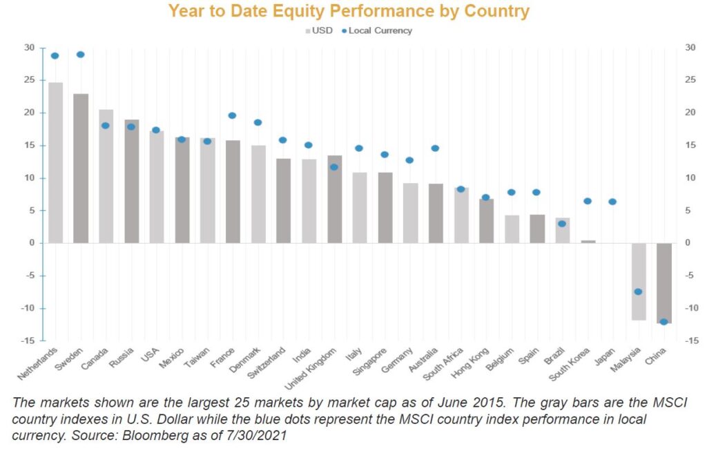 Stocks saw a lot of volatility in 2020, particularly in the first half of the year with 38 single day S&P 500 stock moves +/-2%. This year, it’s been a smoother ride. As of July 31, we have had only four +/-2% days, according to Bloomberg. However, this aggregate benchmark is misleading as different geographies and asset classes such as emerging markets, digital currencies, special purpose acquisition companies and “meme stocks” have experienced elevated drawdowns and volatility.