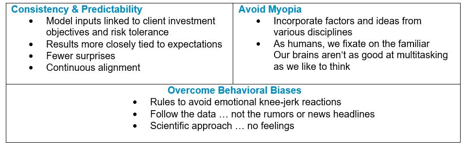 Algorithmic trading models are not a panacea for investment success. Investing is hard, it is difficult to consistently outperform the market, and it is no surprise that many model investment programs have underperformed their targeted benchmarks. But the spectacular success of some does point the initiated in an interesting direction. The reasons to invest under an open, rules-based model methodology are numerous. There is consistency and predictability, the avoidance of myopia, and most importantly, it removes emotion from the investment process and allows the investor to overcome behavioral biases. Furthermore, some model structures are tax advantaged for taxable accounts, and many have an exceedingly low fee structure overall.
