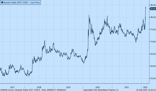 Ultimately, economic sanctions can have a meaningful, if slow, impact on Russia’s economy. The immediate impact caused the Russian stock market to lose a third of its value on Thursday, with the Ruble shedding 11% since the beginning of the year for an all time historical low of 83.44 Ruble per one USD. A sustained decline in the value of the Ruble would raise the prices of all goods imported into Russia and could ultimately lead to high inflation and pressure on Putin to end the war.