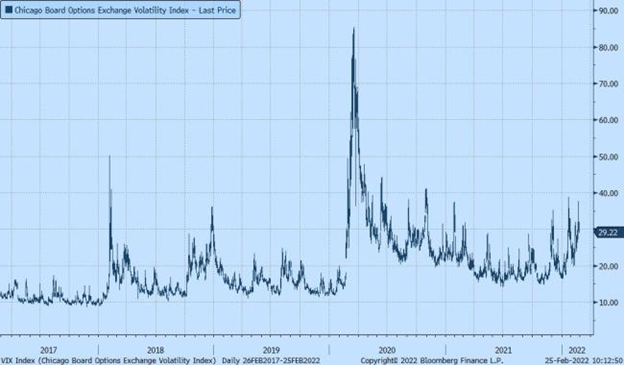The Russian invasion caught the U.S. economy in a state of sustained tension around high inflation and expectations of monetary tightening. The added concern of a large conflict has fueled further anxiety that can be seen in the large swings in the stock market and VIX volatility measure.