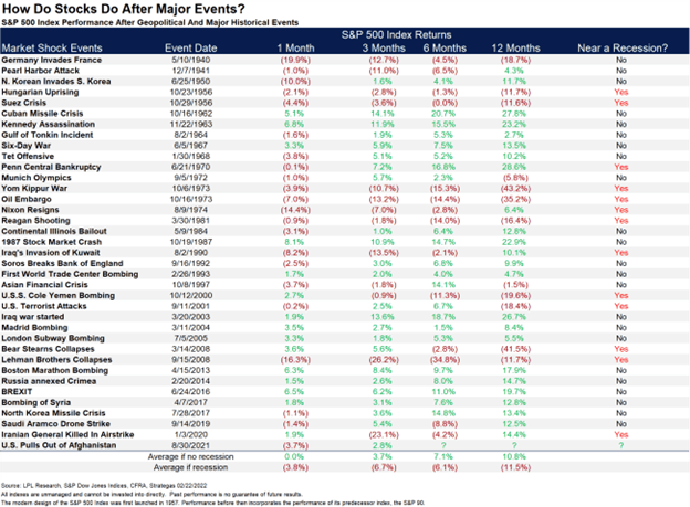 Despite this, most of the volatility in the stock market is likely driven more by headlines than any actual economic impact from the Russian invasion. U.S. companies have limited exposure to the Russian economy. As can be seen in Chart 6, historically geopolitical events have had limited impact on financial markets, with short-term volatility replaced with long performance more closely tied to the domestic economy.