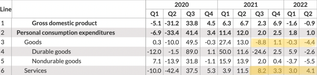 On the supply side, a year of outsized demand for goods were replaced by the massive pent up demand for services— think restaurants and travel. As can be seen in Table 1, although GDP fell in the first two quarters of 2022, and consumer demand for goods has fallen consistently since mid 2021, demand for services continued to rise throughout.