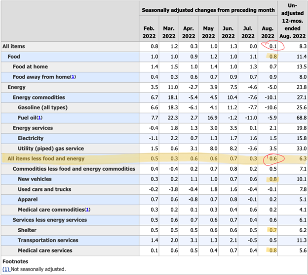 The August inflation numbers are a mixed bag. The top-line inflation number, an increase of 0.1% in prices in the month of August, annualizes well under the Fed’s inflation target of 2%. However a deeper dive into the data suggests that inflation in many sectors including food, shelter, vehicles, and medical care is still rampant. Core inflation, or inflation without food and energy, rose a disturbing 0.6% in the month of August (see Table 1).