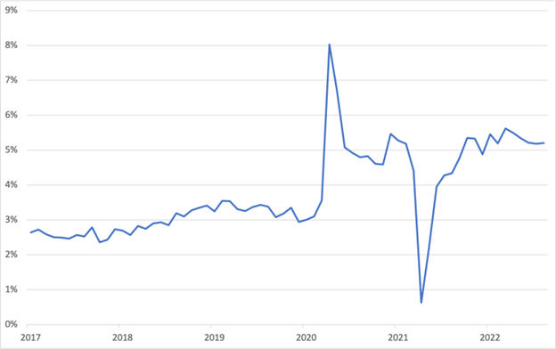 Chart 1 – YOY change in all non-farm employees nominal average hourly earnings, January 2017 to August 2022. Source: Nominal Wage Tracker (Economic Policy Institute)