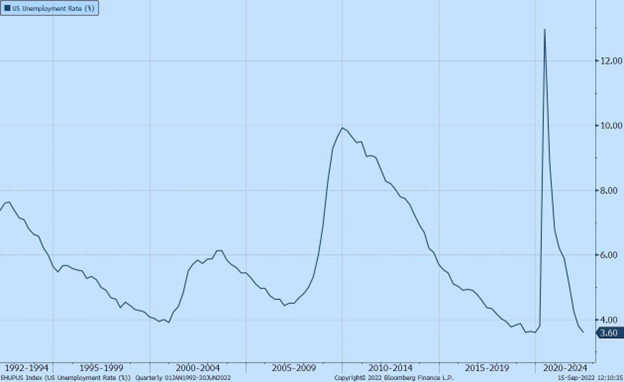 Chart 2 – U.S. unemployment rate (%) since 1992, as of September 15, 2022 Source: Bloomberg Finance
