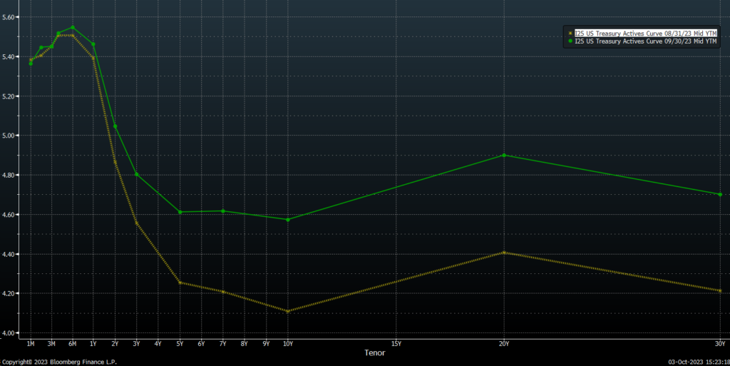 The bond market meanwhile continued to struggle in the face of higher yields, with the Barclays Global Agg down -3.6% in Q3 for a year-to-date return of -2.2%. The yield curve, the return on government bonds of different maturities, remains inverted, with short term yield higher than long term ones. However, as expectations that future rates will remain higher have spread throughout the quarter, the long end of the curve rose significantly. This steepening of the curve suggests that the bond market may be approaching a new normal, one with higher rates across all maturities.