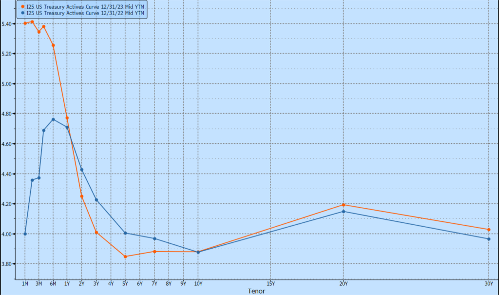 Chart 4: US Treasury Active Curve from December 31, 2022 and December 31, 2023. Downward movement throughout the year in durations between two and 10 years suggests the curve is on its way back to its normal upward slope. Source: Bloomberg Finance.