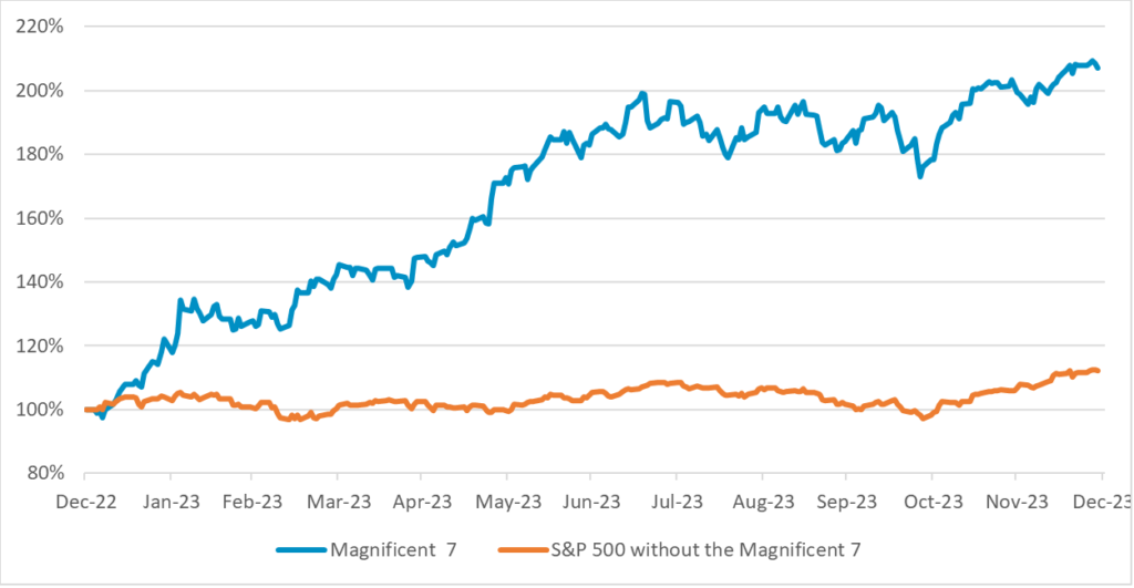Chart 2: Performance of the Magnificent 7 and the S&P 500 without the Magnificent 7 from January 1st, 2023 to December 31st, 2023. The S&P 493, meaning the S&P 500 without the Magnificent 7, rose only 12% for the year, while the Magnificent 7 more than doubled. Source: Bloomberg Finance.