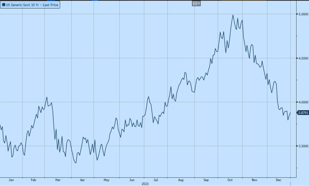 Chart 3: 10-Year Treasury Yield from January 1, 2023 to December 31, 2023. The yield on US 10-year treasury bond saw multiple peaks and touched the 5% range before settling around 3.9%, close to where it started the year. Source: Bloomberg Finance.