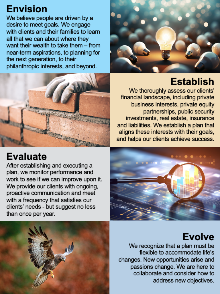 We strive to deliver a more creative approach to financial solutions in all aspects of our client’s lives. By utilizing our 4E methodology, we aim to share and match the client’s vision, provide a great client service experience, thoroughly evaluate investments and liabilities for all clients, and support our clients if there are any life changes. We believe our 4E methodology combined with the expertise in both our Investment Office and Wealth Planning allow us to meet and exceed the unique goals of our clients.