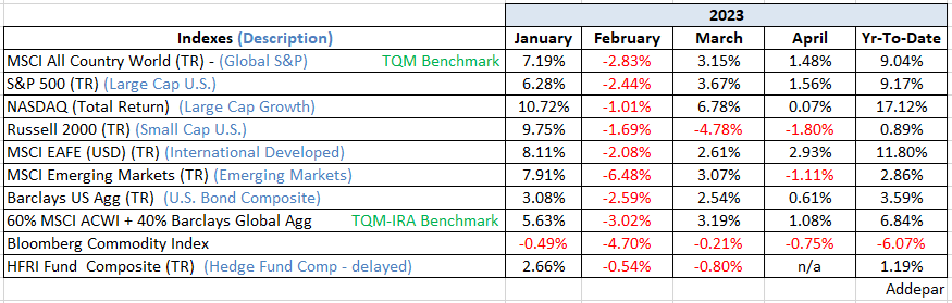Thus far this year, positive economic momentum globally has supported risk assets. Just a little less so in the U.S. as we have had to live under the cloud of further stress in the banking sector. See returns below.