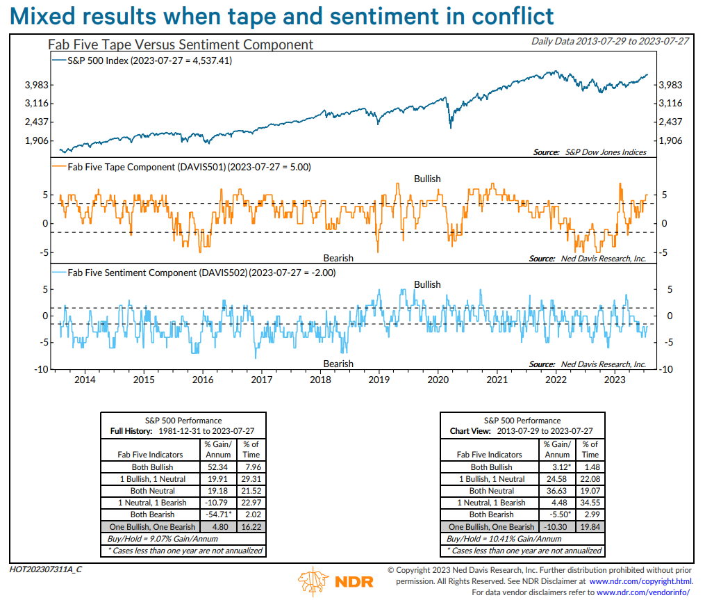 But what has happened historically when one of these indicators is opposite of the other. Today the tape is understandably positive (see Y-T-D column above) but sentiment is ebullient (bearish indicator for stocks). The results have been very mixed and choppy.