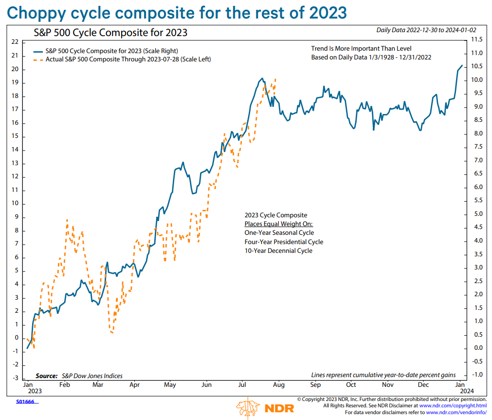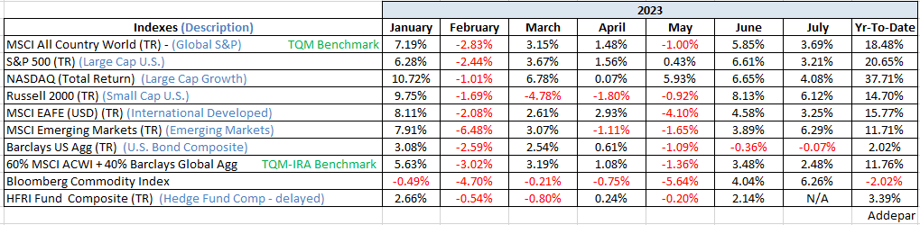 Investors’ feelings toward stocks (market sentiment) remained positive in July. A drop in inflation and resilient GDP data buoyed those feelings – maybe overly so. Stocks did well across styles and around the world. The 3.21% gain in the S&P 500 Index was beaten by large and small caps domestically, and International Developed and Emerging Markets abroad. Bond prices ended the month mostly unchanged – small gains internationally and small losses domestically.  Commodity prices reversed some of their year-to-date losses with the broad Bloomberg Commodity Index rising 6.3% for the month, which is raising concerns about inflation popping back up in the weeks ahead.