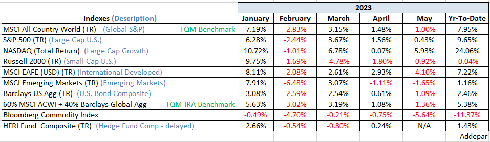 The debt ceiling impasse generated negative headlines all month. Despite the drama and because of the AI complex, equities were relatively resilient with the S&P 500 rising by 0.4%. Commodities had their worst month of the year so far, which has to be good for the inflation picture. Bonds also had a tough month having to adjust to the possibility of higher peak cycle rates.
