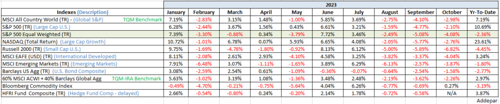 While normally placed at the end of the monthly letters, let’s flip the script this month and start out staring at the performance chart below. We’ll stare not in any contemplative way but rather to absorb the unadulterated message that 2023 has been a year of the few – 7 magnificent winners and 493 not named winners, to be exact.  Rarely in history has there been such dichotomy between winners and losers. In market cap and style: large cap growth +23.62% ytd vs -4.45% for the Russell 2000’s small cap value constituents. This dichotomy is lasting too, it would seem. This month, the green line-item ,“S&P 500 Equal Weighted (Total Return) Index Returns was added to the chart, for illustrative purposes.  The magnificent 7 represents about 27% of the S&P 500 Index by (market cap). In the equal weighted index, each component contributes 1/500th to the index’s makeup. Notice the comparison between the two below; the dichotomy really got going in March for 3 months when AI dominated financial headlines. It resumed this fall in the market sell-off the past 3 mo. when the spread between the two widened.